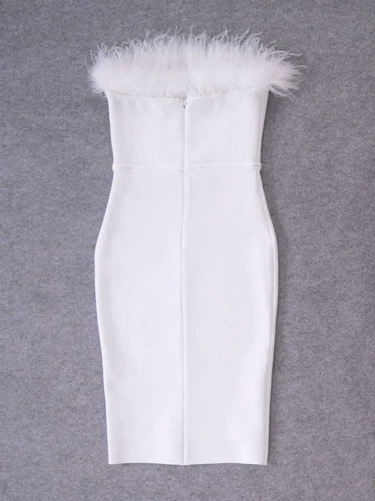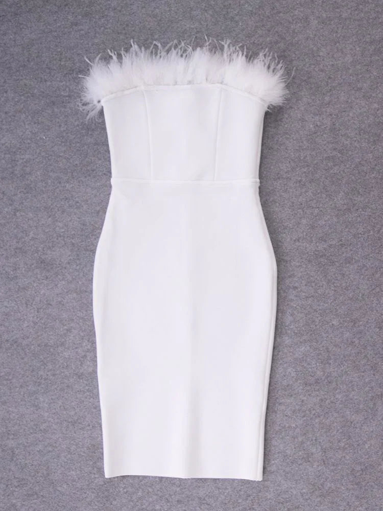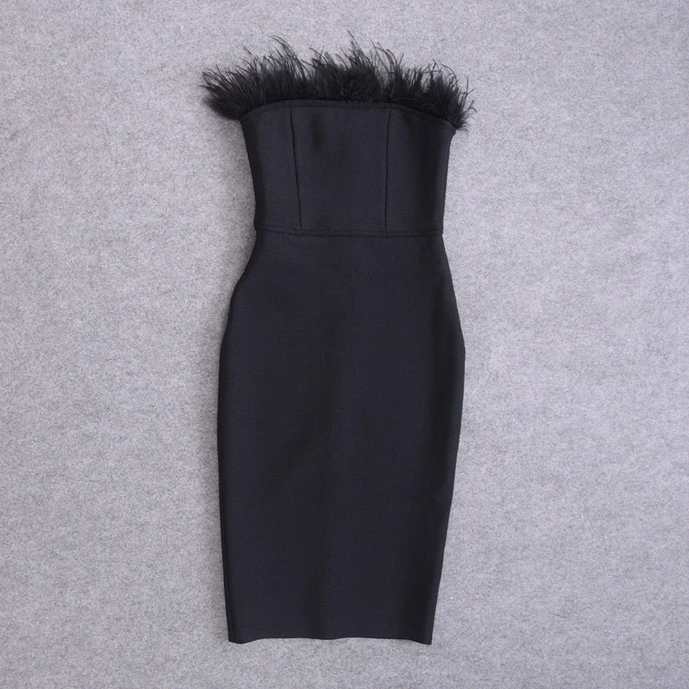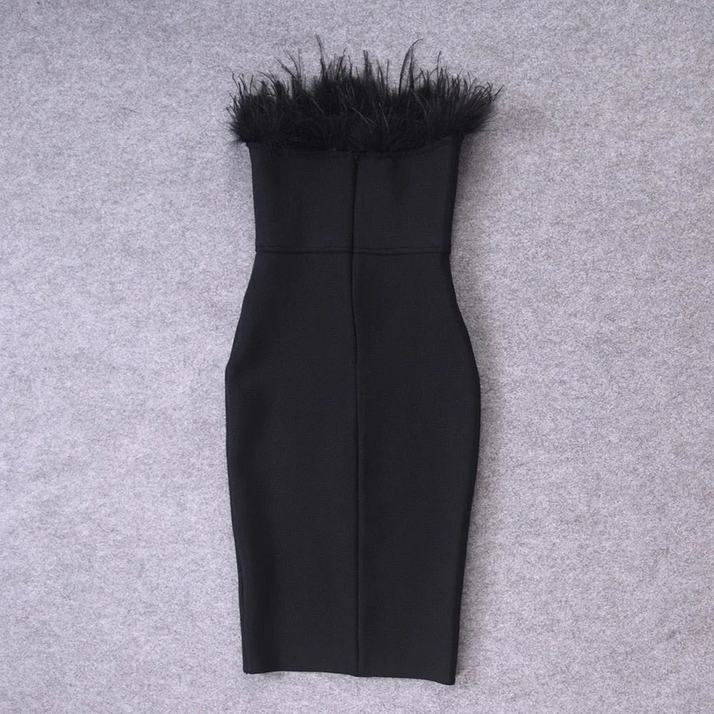 The Glamour Women's Dress is the definition of charm and style for those who want a striking and modern look. This strapless mini dress is a real showstopper, perfect for special occasions where you want to shine. One of its most attractive features is the feather appliqués on the bust, which add a rich texture and a touch of glamour to the dress.