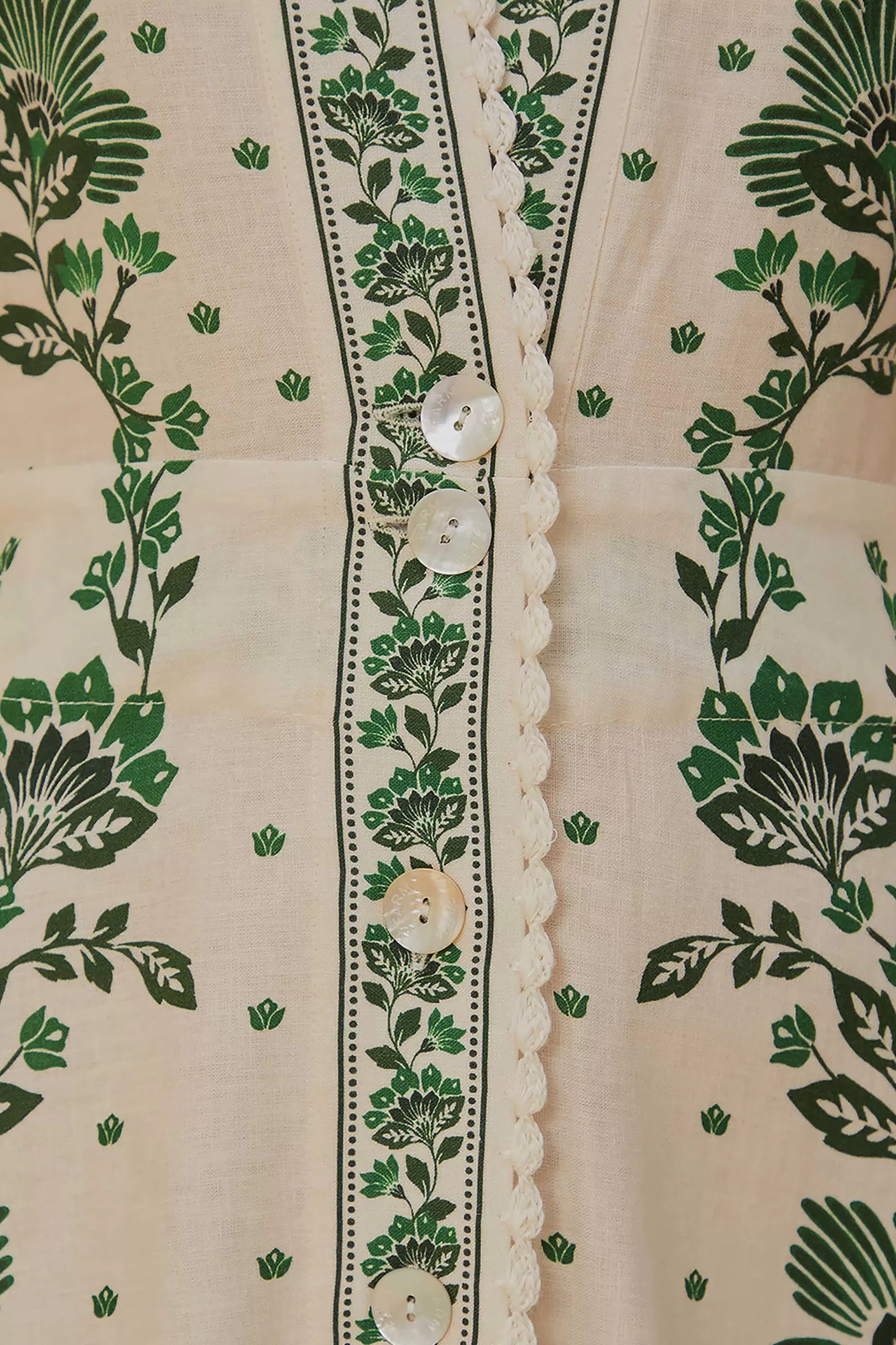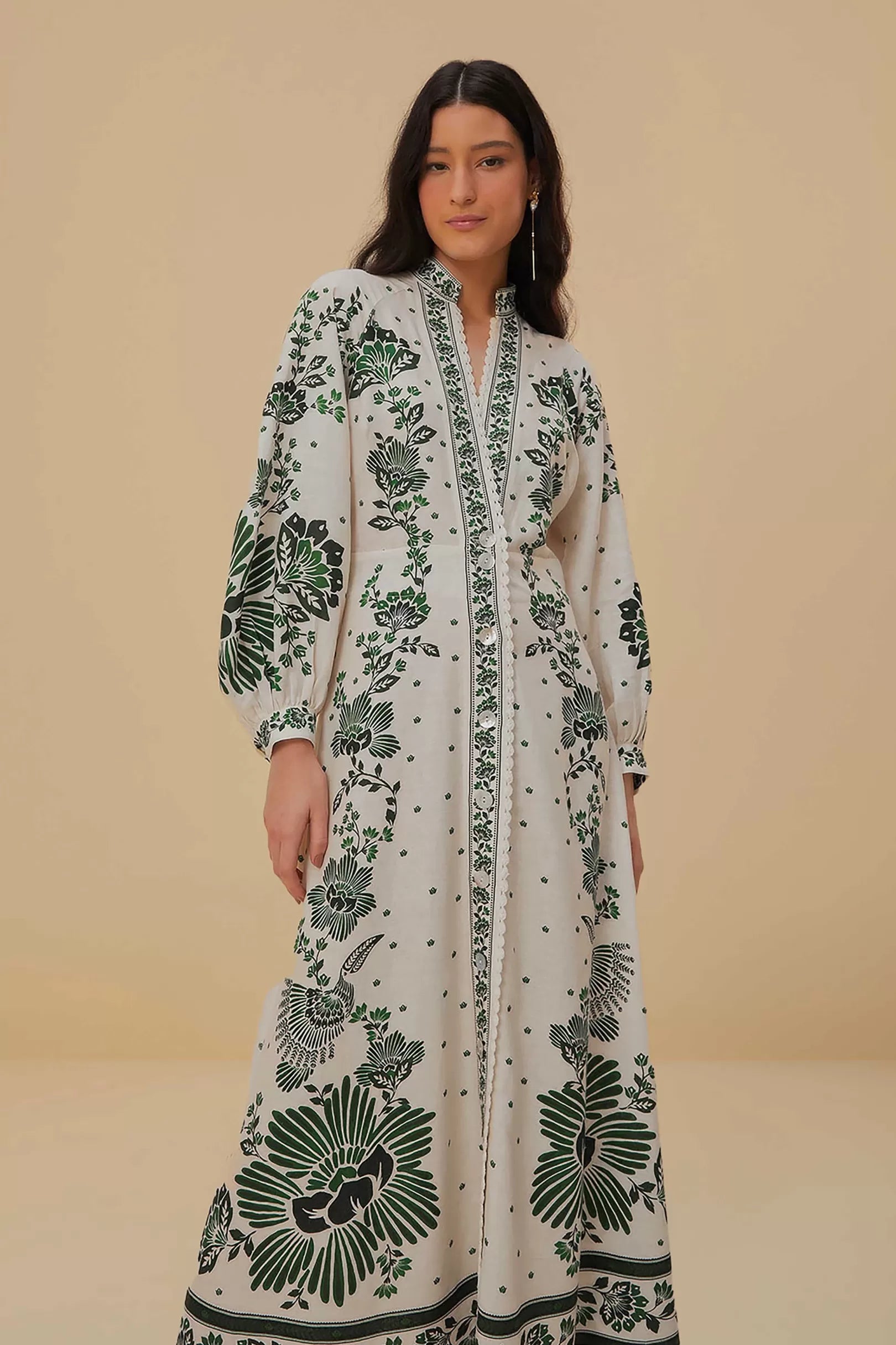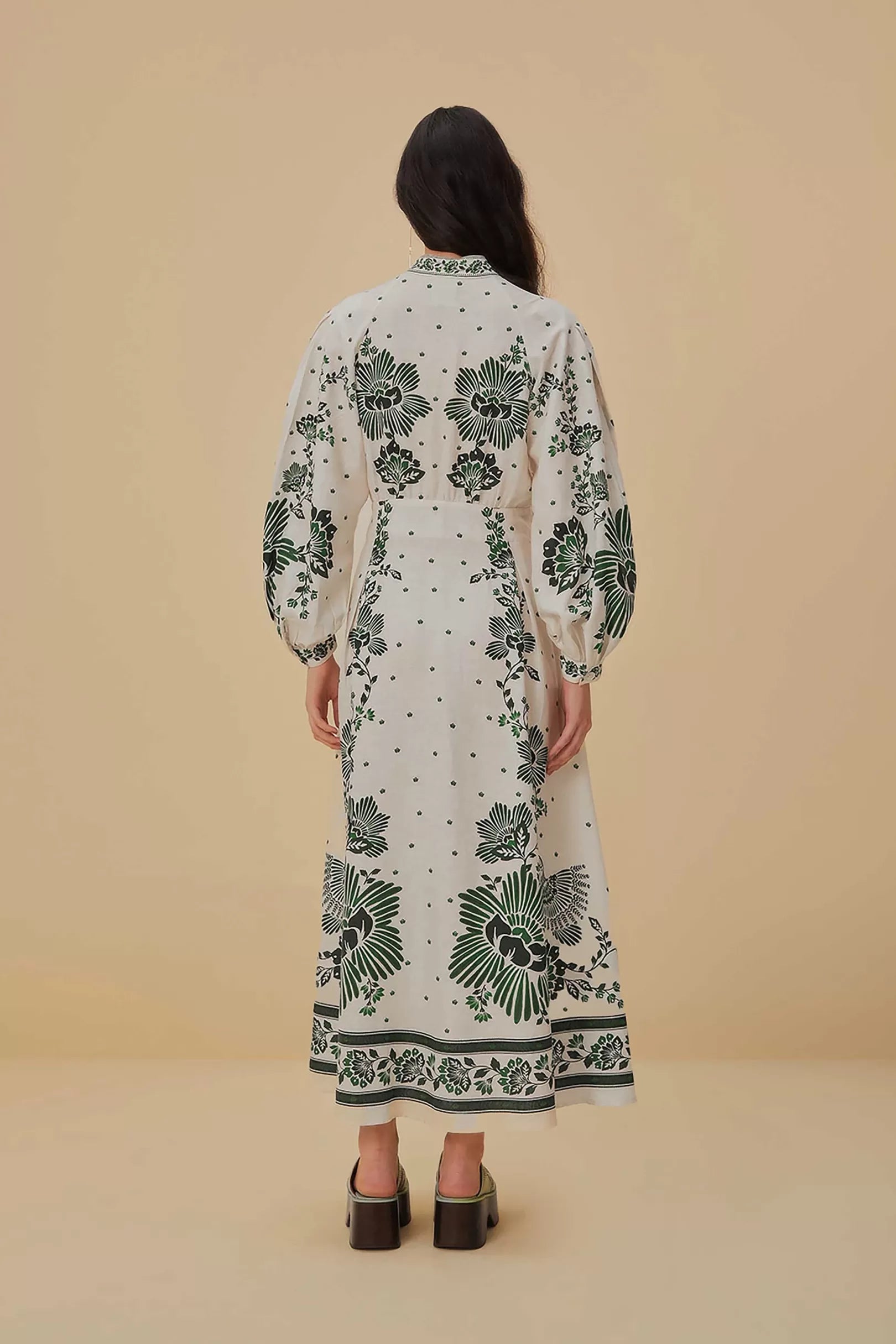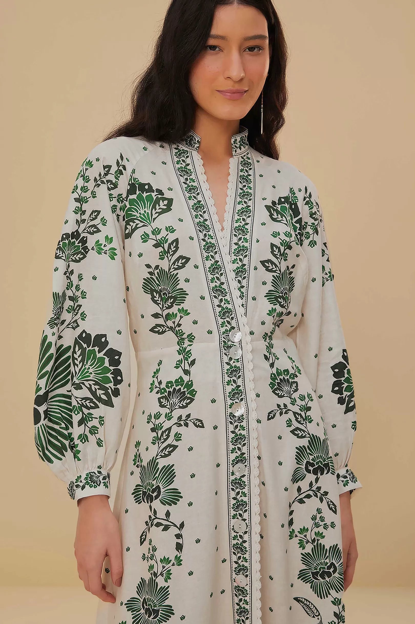 The perfect blend of sophistication and comfort, designed to make you stand out effortlessly. This stunning dress features a luxurious white fabric adorned with intricate green floral motifs , embodying a timeless botanical charm .
