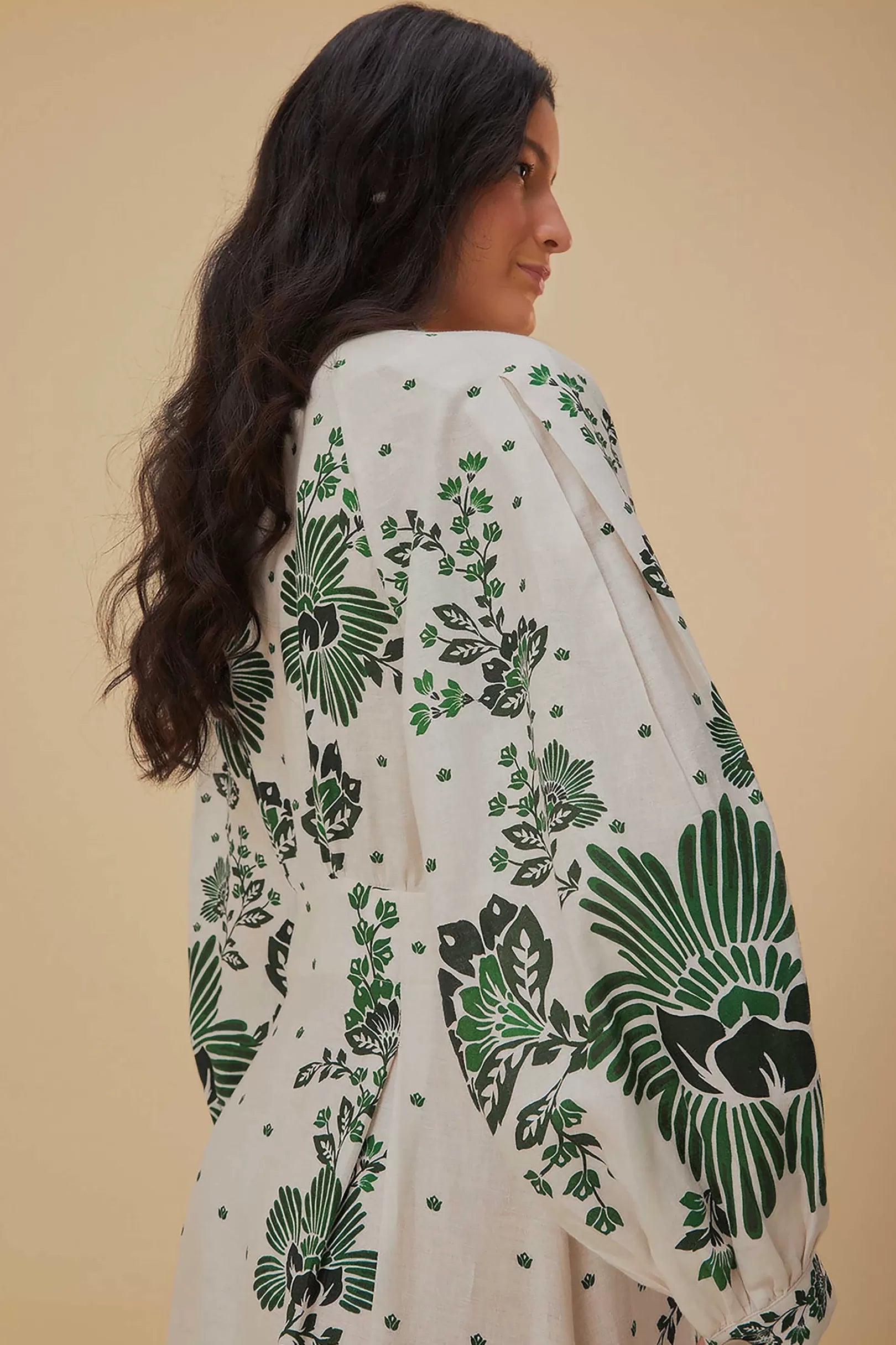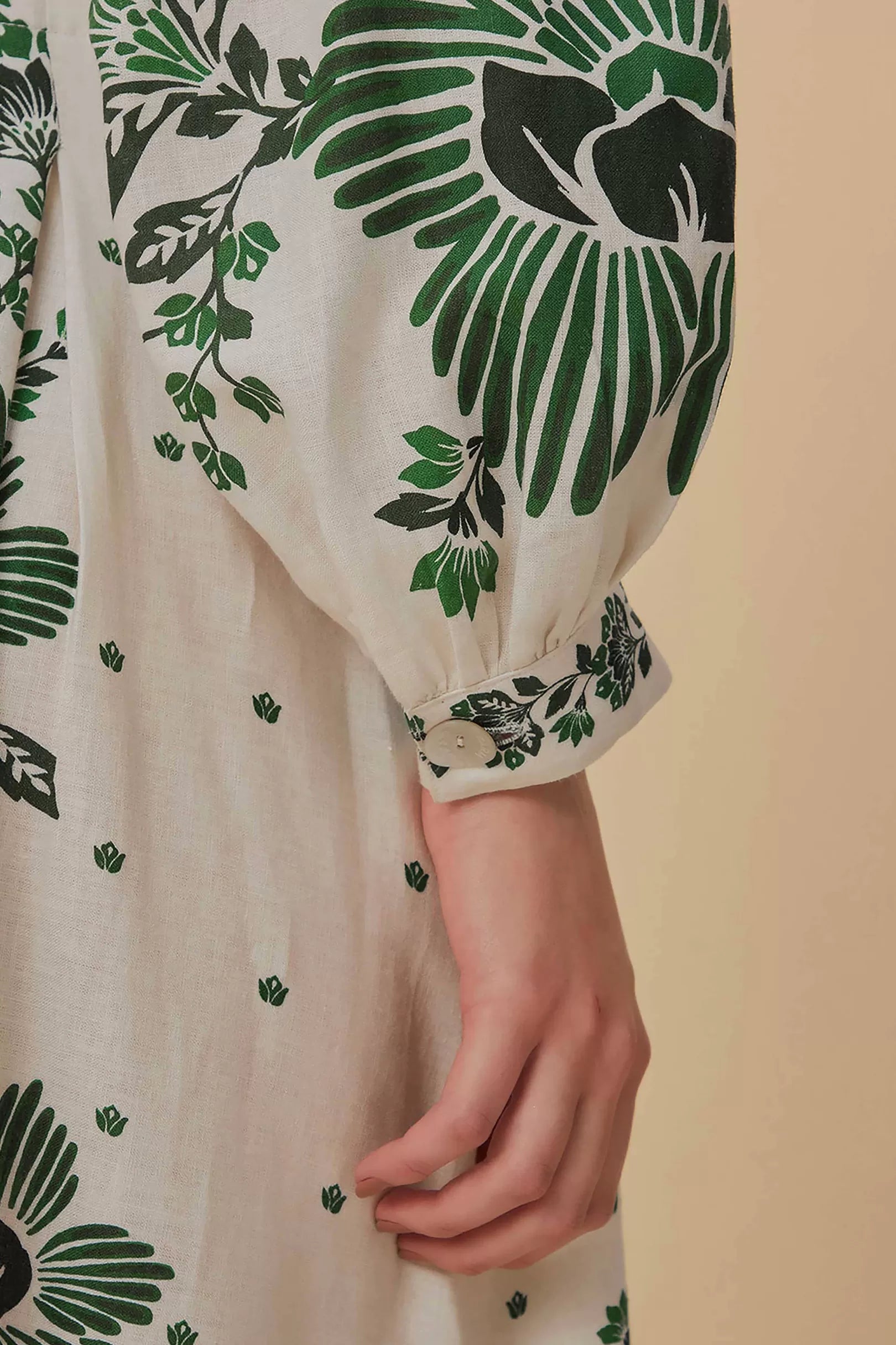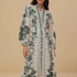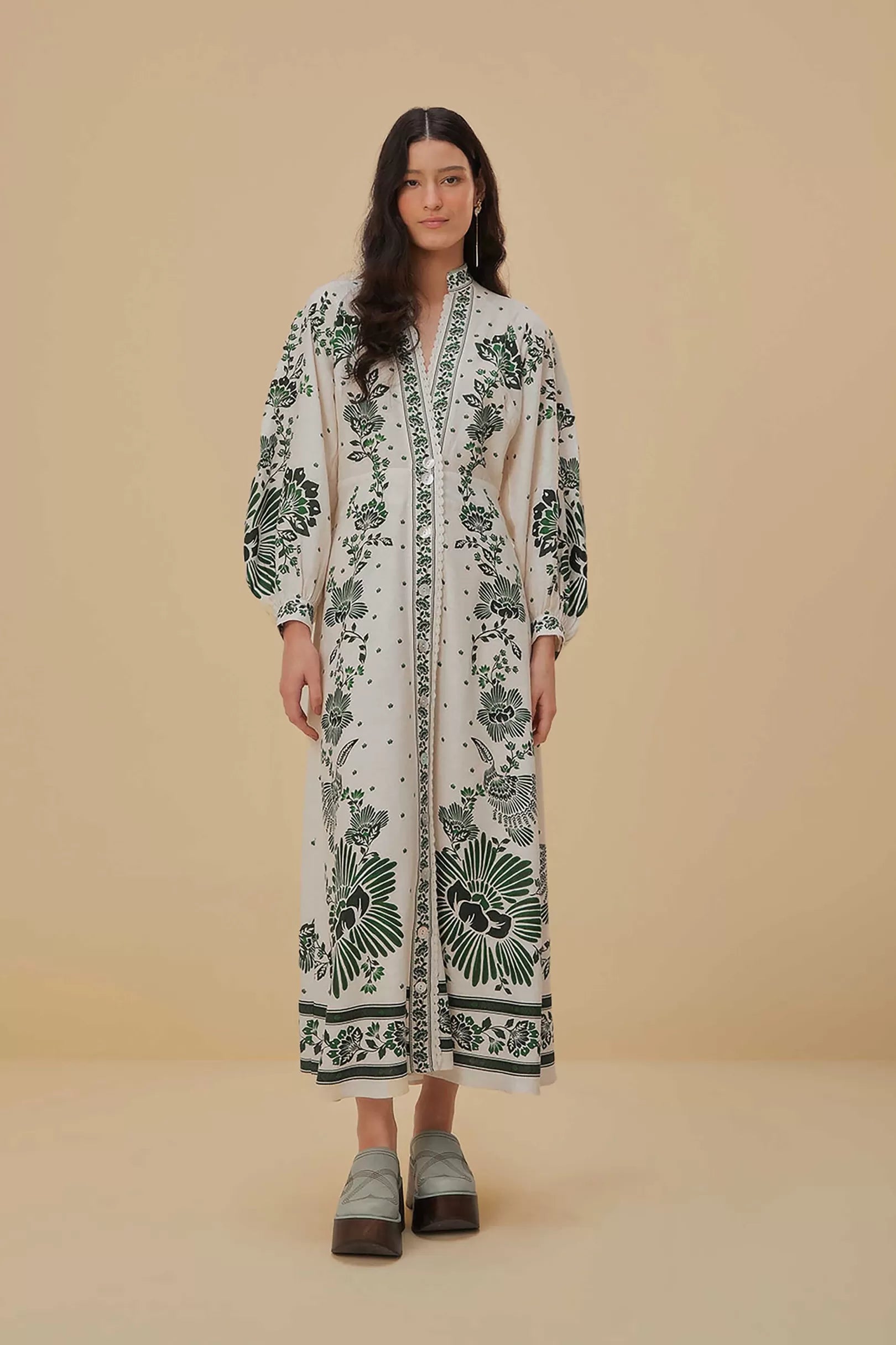 The perfect blend of sophistication and comfort, designed to make you stand out effortlessly. This stunning dress features a luxurious white fabric adorned with intricate green floral motifs , embodying a timeless botanical charm .