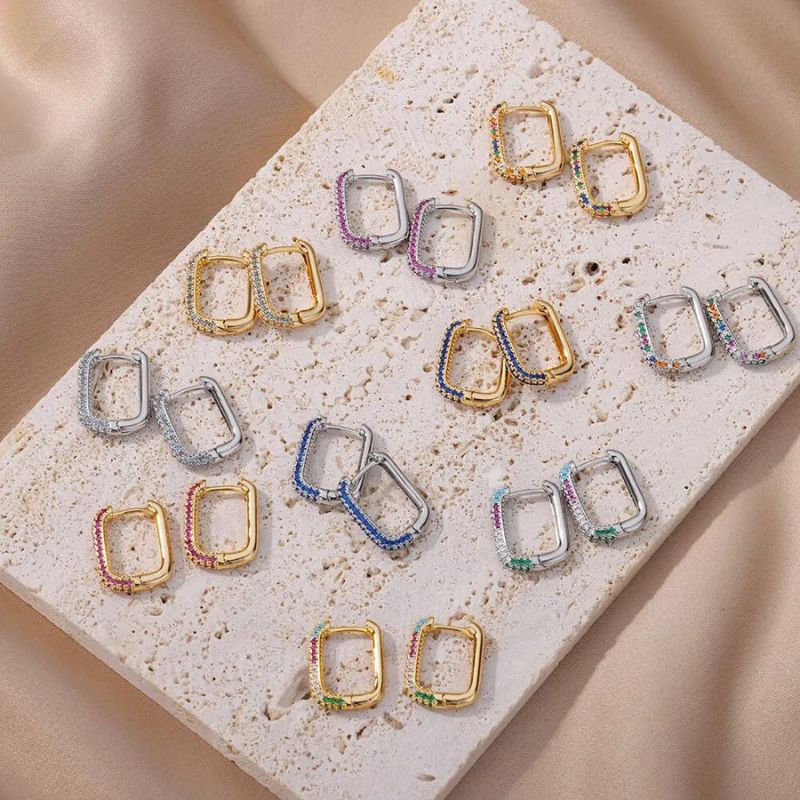 The earring features a ring skillfully crafted from precious metal, often gold or silver, which offers durability and a luxurious finish. The hoop is adorned with a variety of colored zirconias, strategically set around the surface, creating a rainbow of sparkling colors.