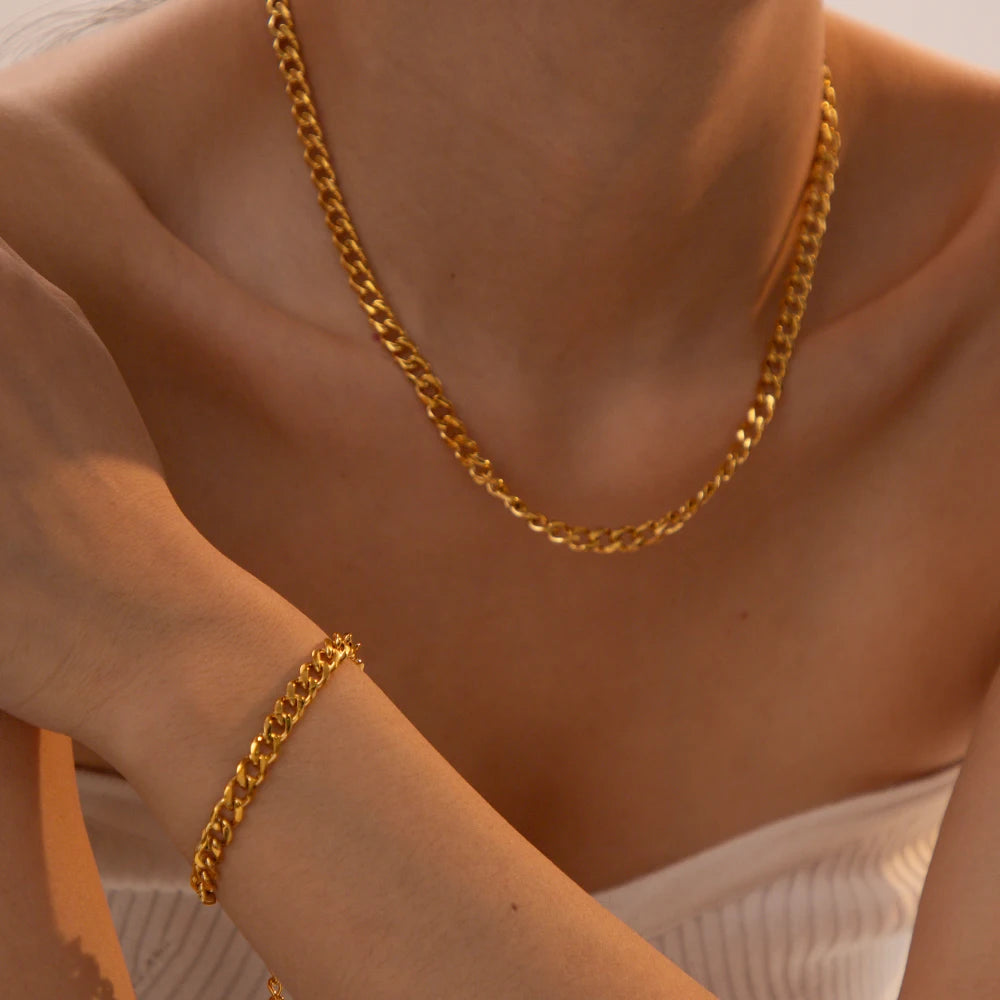 A Link Necklace and Bracelet Set offers a harmonious and elegant combination. Composed of a necklace and a bracelet, both featuring interlocking links, this set provides a sophisticated and modern look. Ideal for those who appreciate coordinated accessories, the set is versatile and can be worn on various occasions to add a refined touch to your look. Hypoallergenic, nickel and lead free.