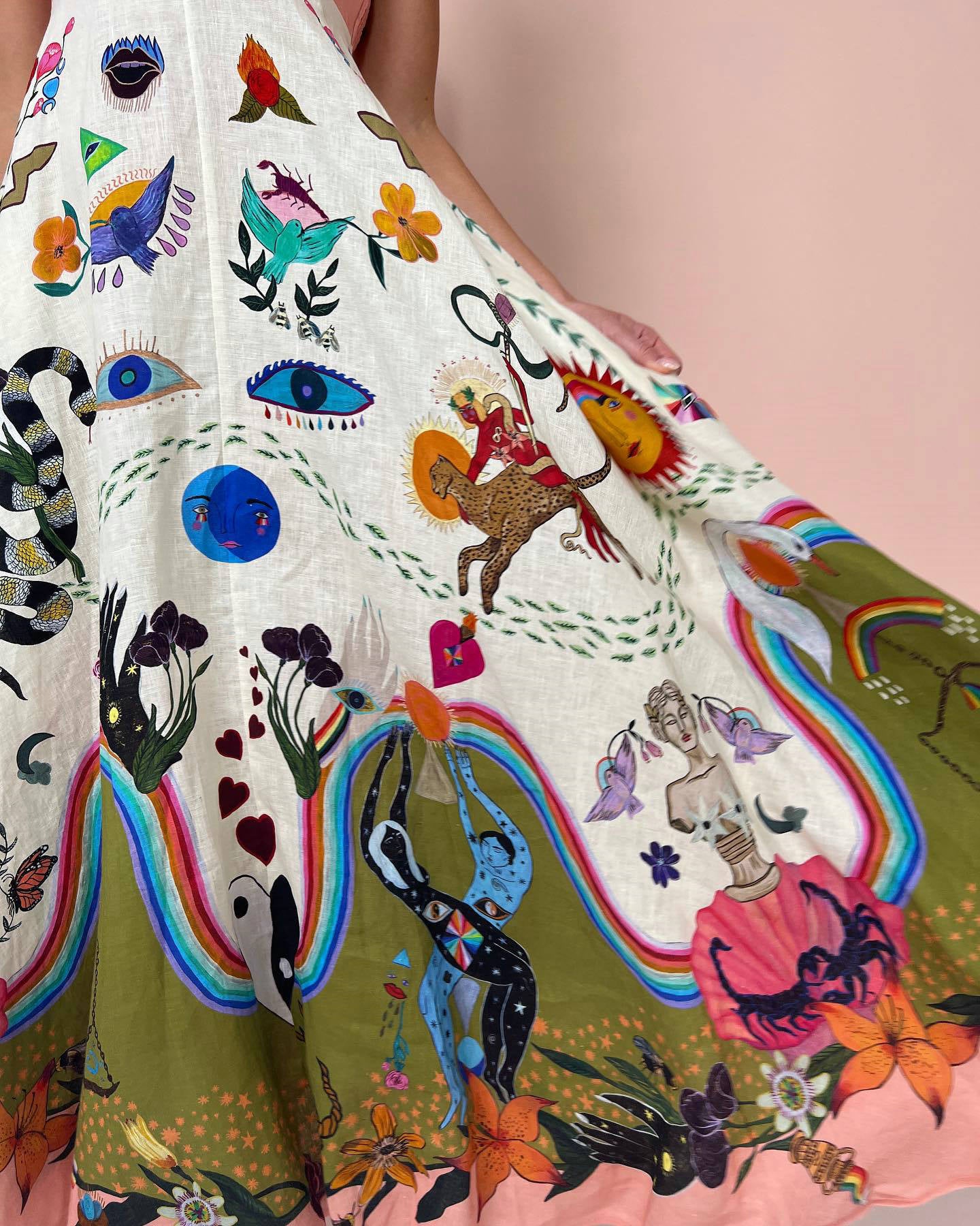 The Long Printed Midi Dress is a unique and vibrant piece that celebrates creativity and individuality. With an exclusive and colorful print, this dress is ideal for artistic events, theme parties and special occasions. Made from lightweight, breathable fabric, it offers all-day comfort, keeping you stylish and confident.