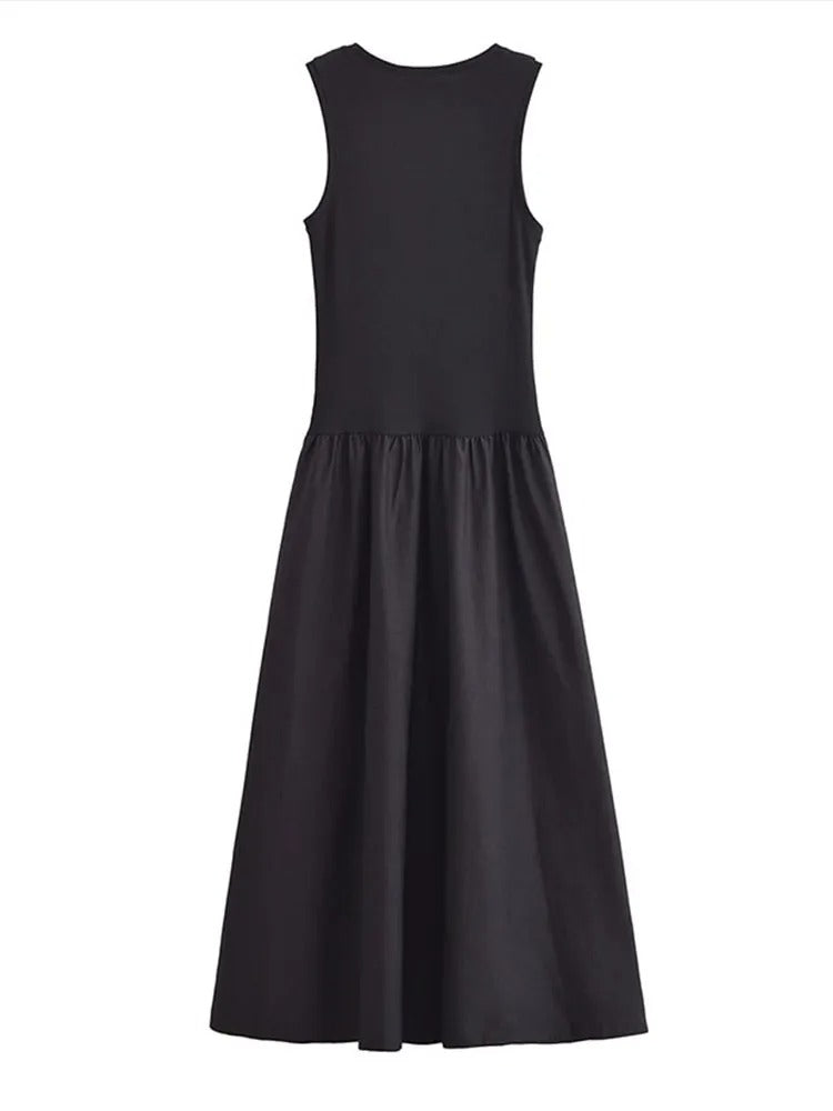 The patchwork design, made up of different textures and patterns, adds an artistic and unique feel to this dress. The loose, irregular patches create a casual, relaxed effect, contrasting elegantly with the sophisticated pleats.