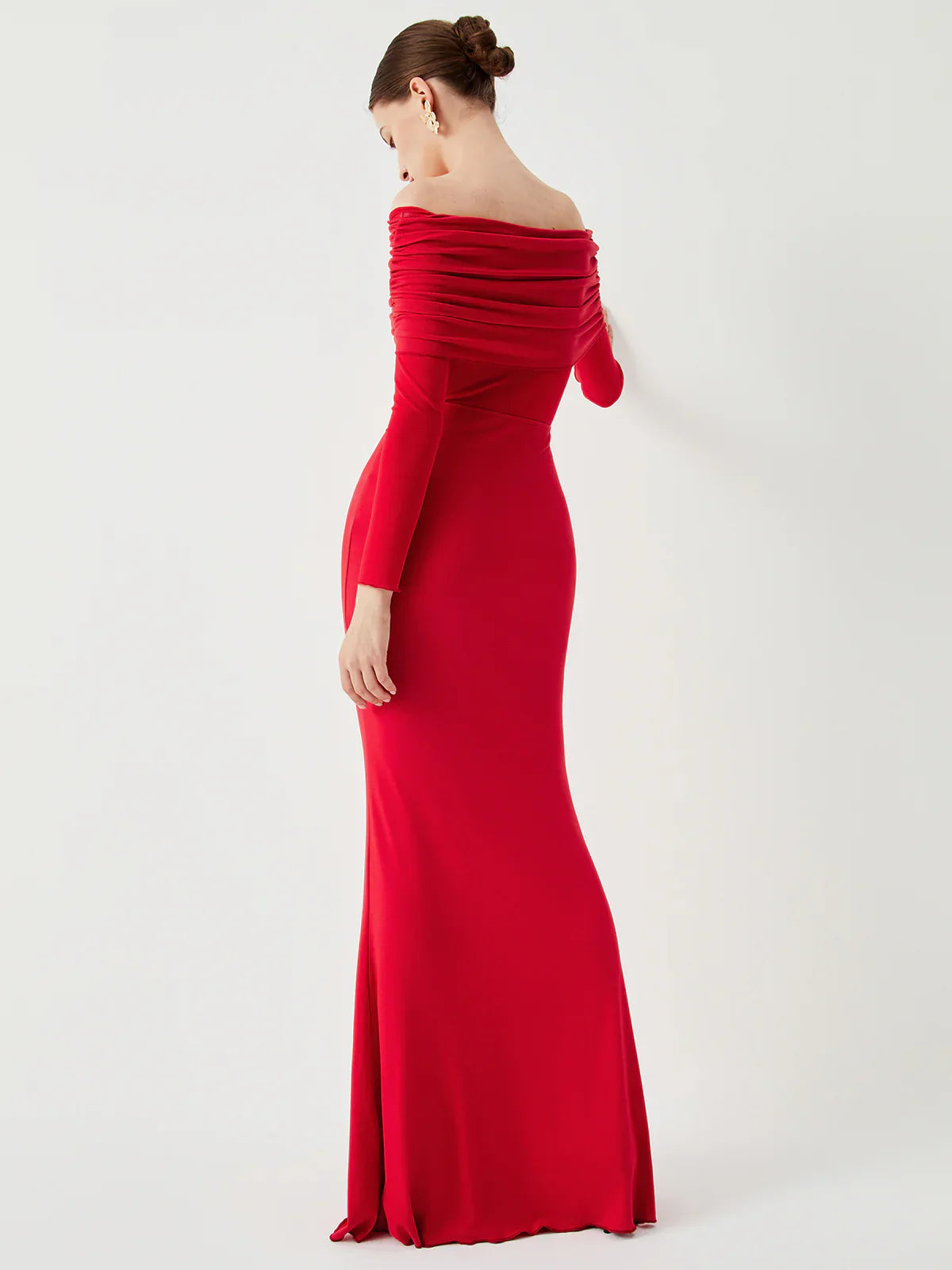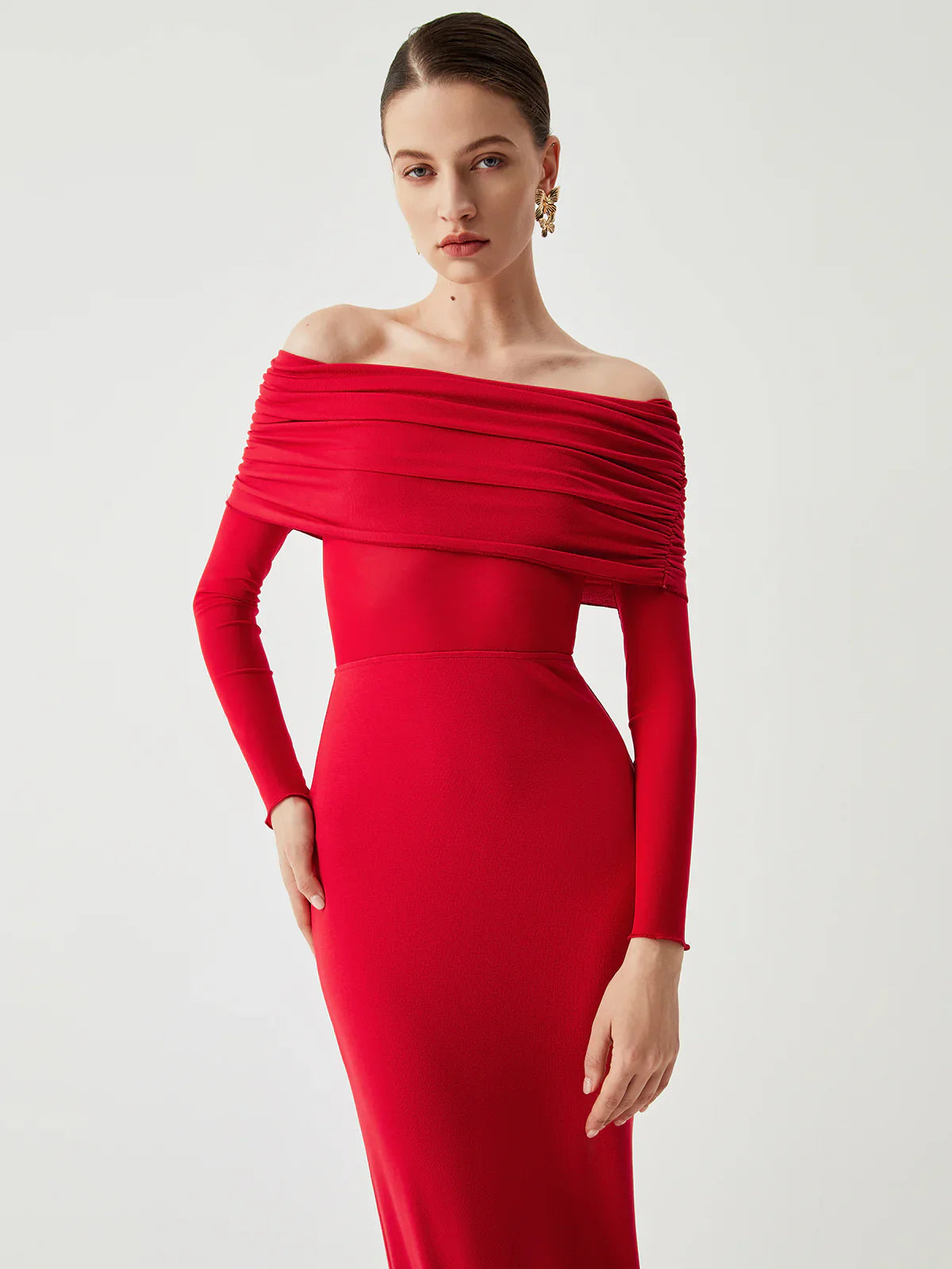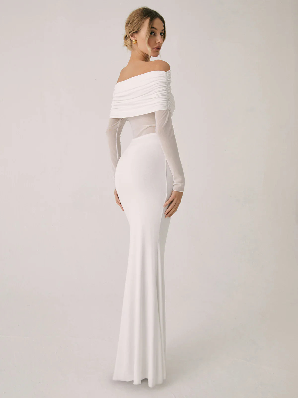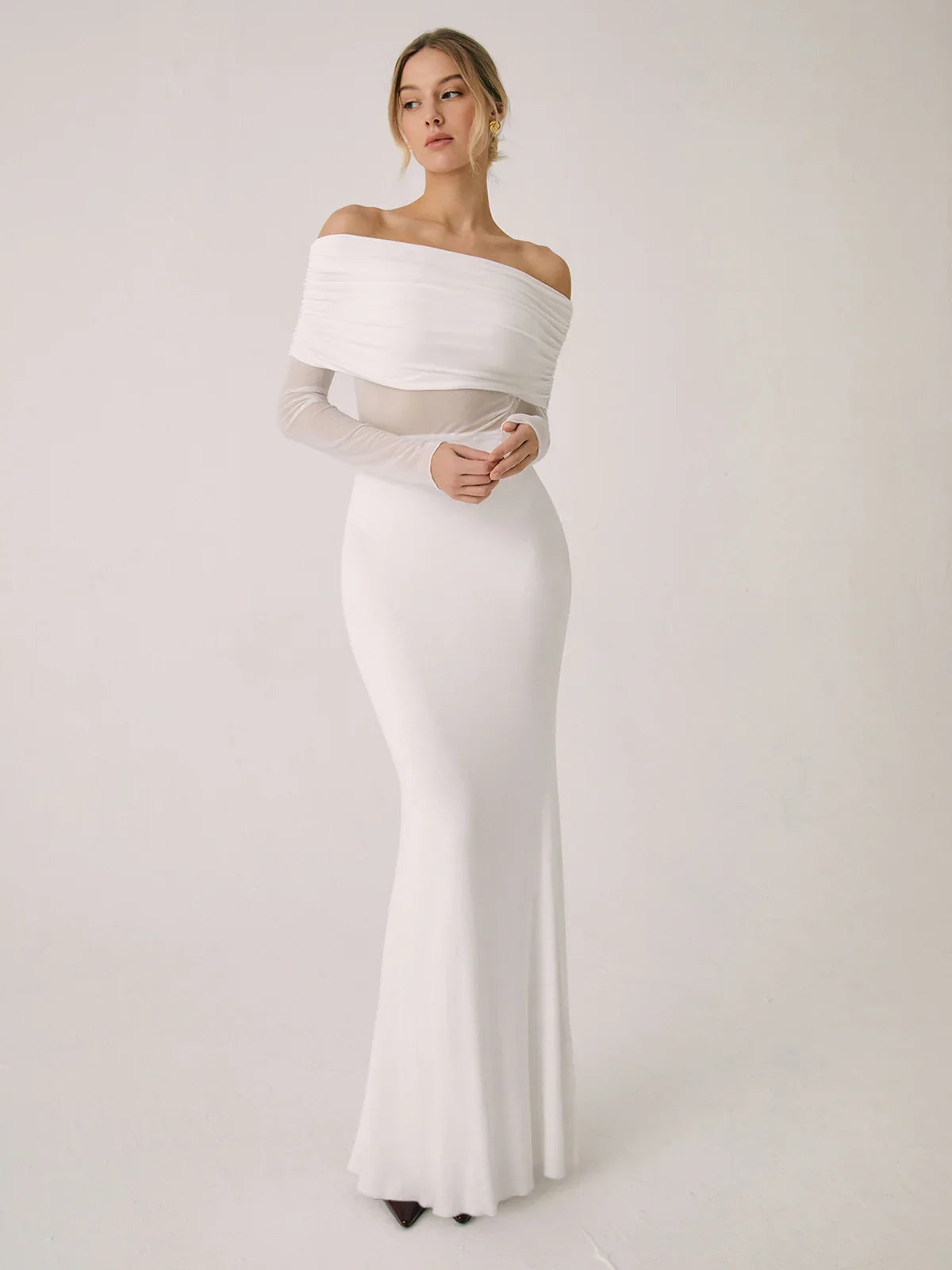 Overfold Off-Shoulder Mesh Sleeve Long Dress