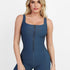 • Double-layer waist panel, in which the shell layer is faux denim fabric while the inner layer fits with ultra-strong shaping mesh, with waist trimming and abdomen tightening that has a slimming effect on your figure.