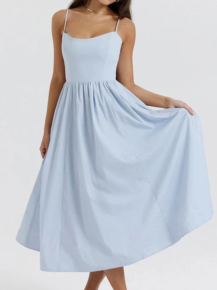 Adorn yourself with the timeless elegance of the dress, an A-line midi dress that flows gracefully. Its backless design and spaghetti straps add a flirty touch, while the retro French style evokes classic charm. Perfect for any casually chic occasion.