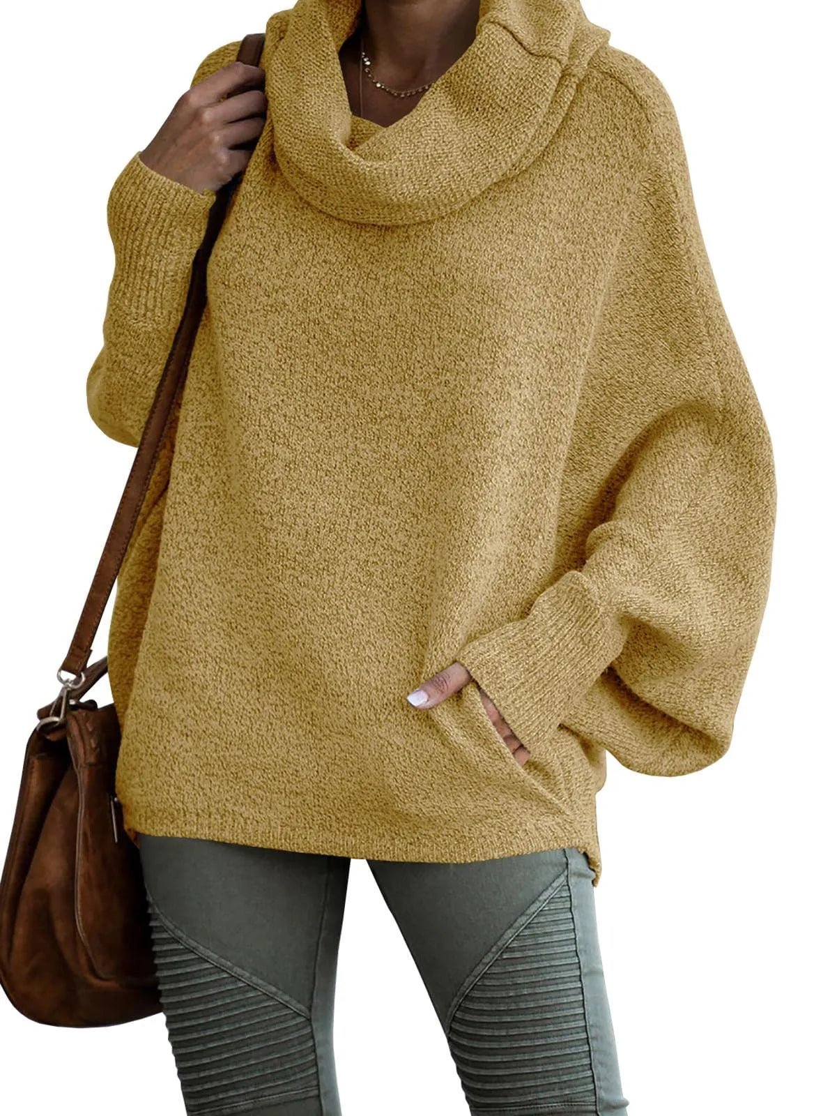Women's Cowl Neck Batwing Sleeve Pullover Sweater with Pockets