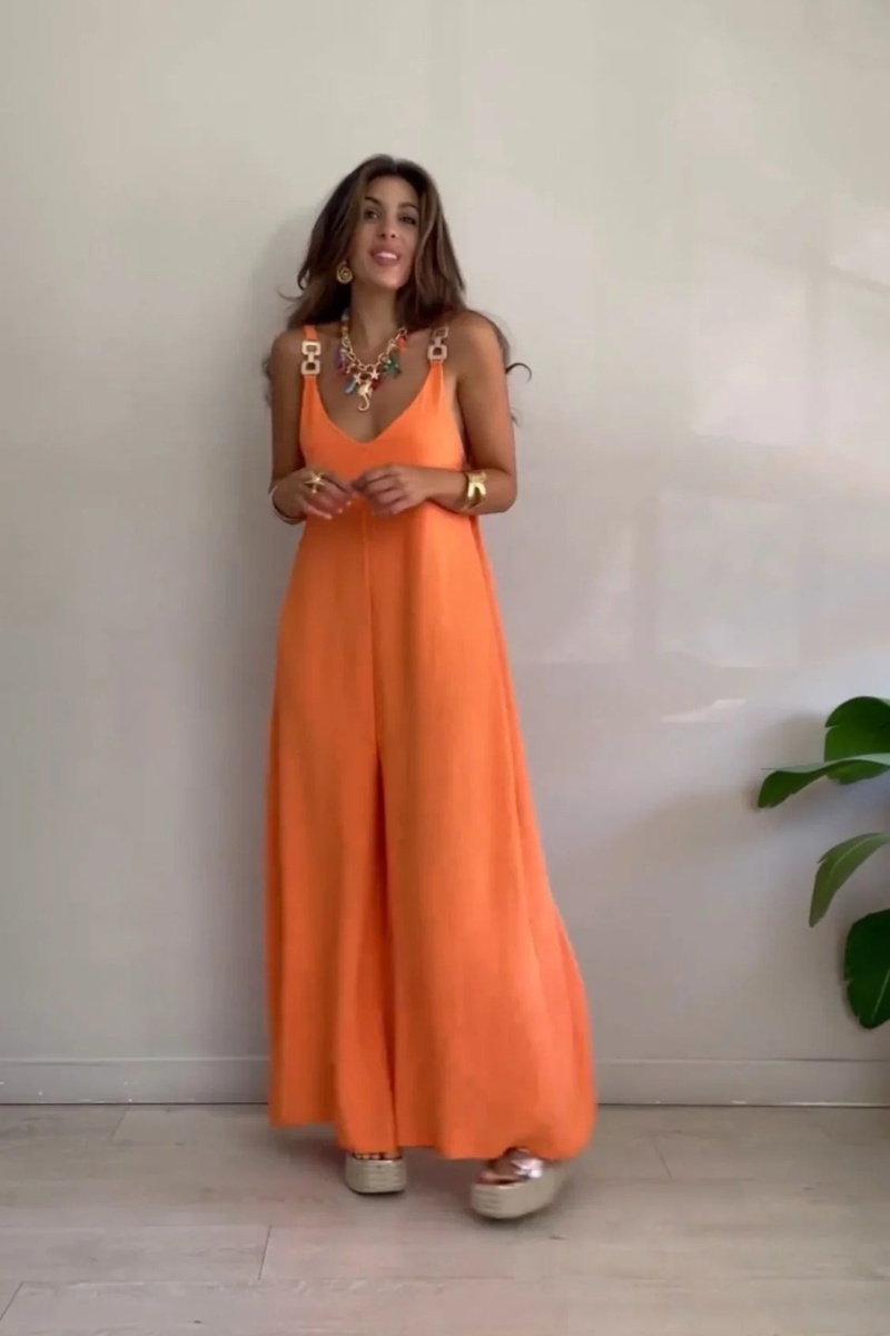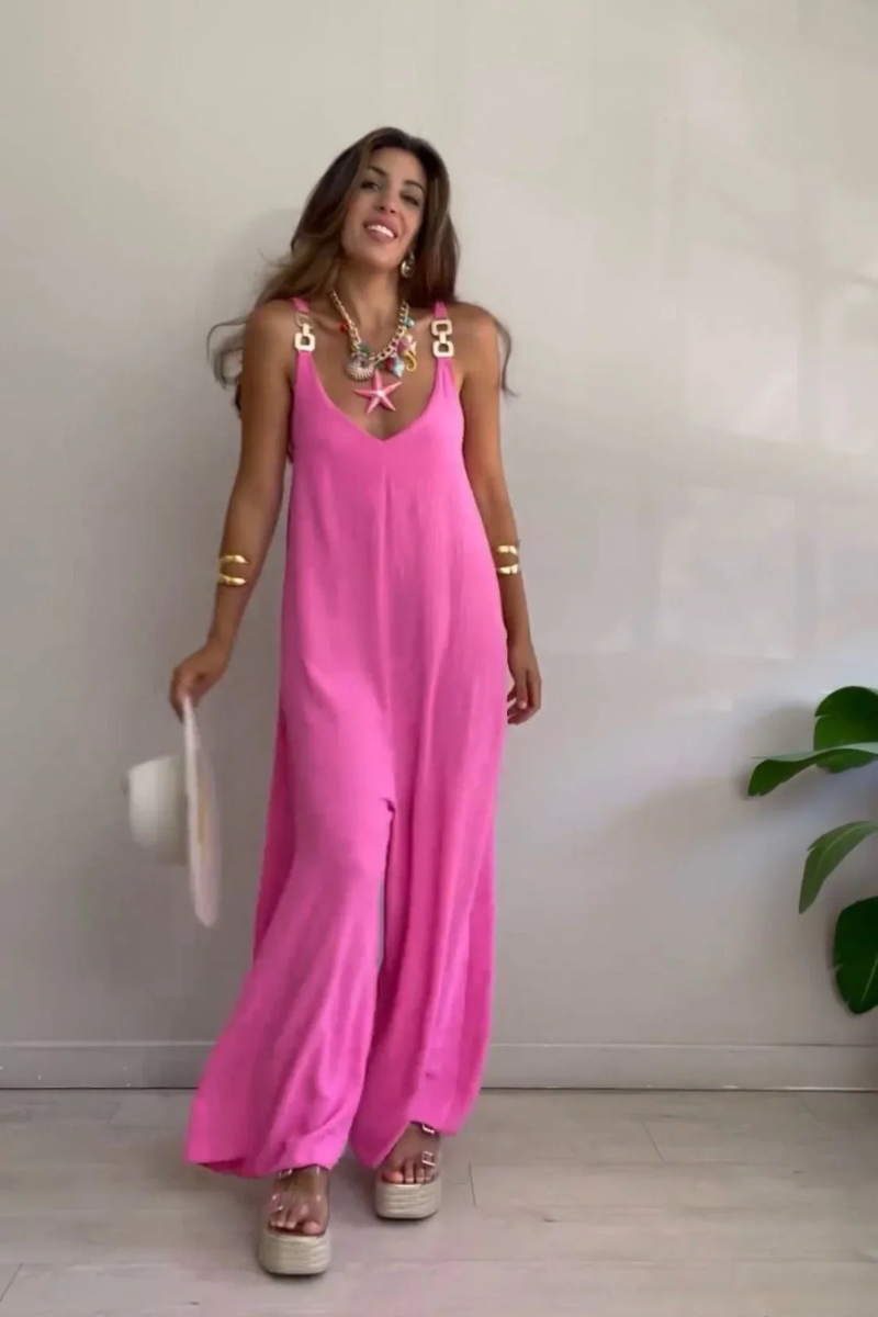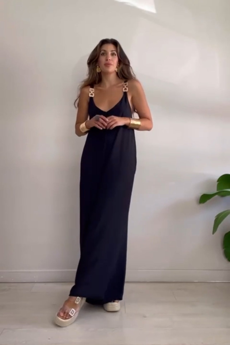 The Women's Long Elegant Jumpsuit with shoulder straps and super light fabric for coolness, composed of 95% polyester and 5% high quality elastic.